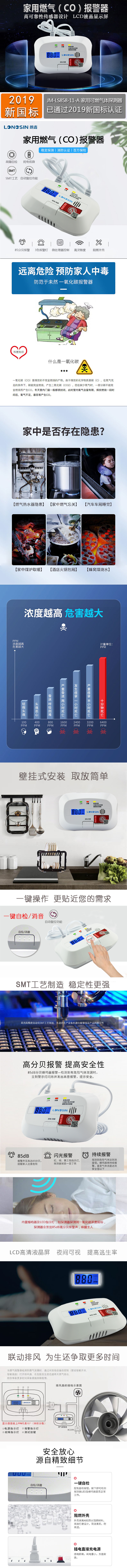新国标一氧化碳气体报警器(以下简称报警器),用于检测一氧化碳CO气体的泄漏。报警器选用先进的电化学一氧化碳传感器,具有稳定性高,灵敏度漂移小等特点。产品采用背光数字LCD显示报警浓度,报警器可工作范围在AC110~230V之间,并具备安装后备用电池功能。当报警器探测到有一氧化碳气体泄漏并达到报警器设定的报警浓度时,报警器红色LED。闪烁,并发出报警声音。本产品应用于有可能产生一氧化碳气体的场所。