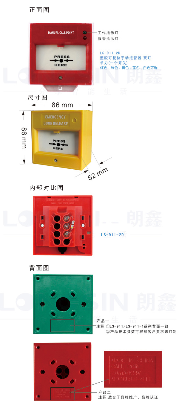 手动火灾报警按钮(两个指示灯)LS-911-2D采用ABS防火材质,单刀。两个工作指示灯.